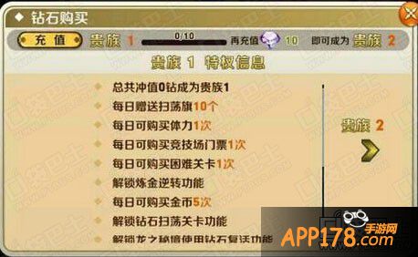 价格1元,包括贵族1所有特权。贵族2特权:每日赠送扫荡旗20个、每日体力购买2次,购买金币10次,每日可兑换蓝、紫、橙色熔炼卷轴各8次,游戏好友上限到60,每日语音聊日公共上限到50、私人上限到50、职业上限到40,每日可花费钻石购买各幻兽强化2次。