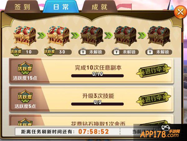 游戏中有一系列的日常任务,完成日常任务可获得对应的活跃度,达到一定的活跃度即可开启活跃度宝箱领取奖励。活跃多多,宝箱多多哦。