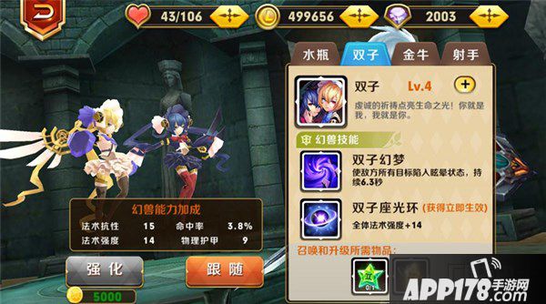 《天天传奇》幻兽系统是特色亮点之一,玩家通关第二章关卡即可解锁,并且获得系统赠送的水瓶座幻兽。幻兽的技能分为主动与被动两种,技能的作用和伤害随着强化等级的提升而增强。目前游戏共开放了水瓶、双子、金牛、射手四种幻兽,玩家可以通过多种途经获得、培养。