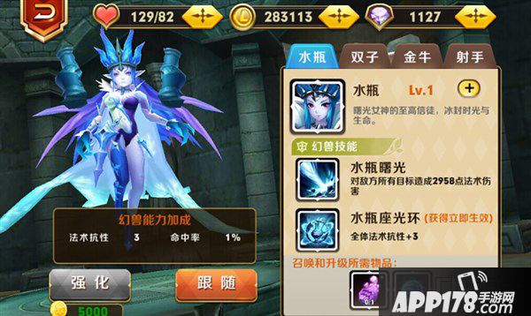 当玩家在游戏中第二章全部通关完之后,往主界面左边滑动两次就可以进入到召唤兽系统,在召唤兽系统中玩家可以看到当前游戏中只有4只幻兽,分别为水瓶、双子、金牛和射手,游戏中的每位幻兽都有着2个技能,一个技能为攻击力,另一个技能则是对全体队员的技能加成。当玩家成功解锁召唤兽系统后,系统将会免费赠送水瓶幻兽,水瓶幻兽拥有对敌方所有目标造成2958点法术伤害的水瓶曙光技能,和令全体队员的法术抗性+3光环技能。