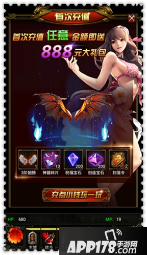 商城中每种商品首次充值时均可获得3倍奖励还可领取首充礼包,礼包内容:3阶翅膀*1、神器碎片*10、祝福宝石*200、创造宝石*200、扫荡令*2。