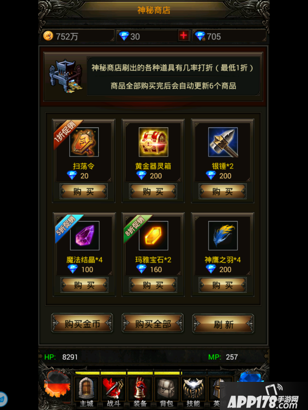 神秘商店每次同时出售6件商品,当商品购买完毕后,会自动进行刷新。