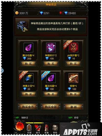 神秘商店每日固定刷新,每次刷新后会随机出现6个随机道具,有可能出现超低折扣道具(最低一折),同时可以通过钻石手动刷新,每次花费50钻。