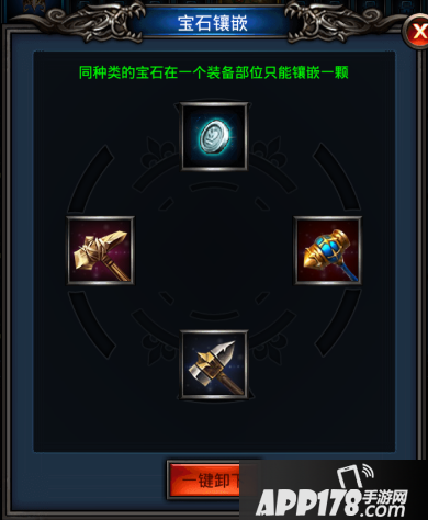 主角10个装备栏,每个装备栏最多可以镶嵌4颗不同种类的宝石,战力飙升不再难!