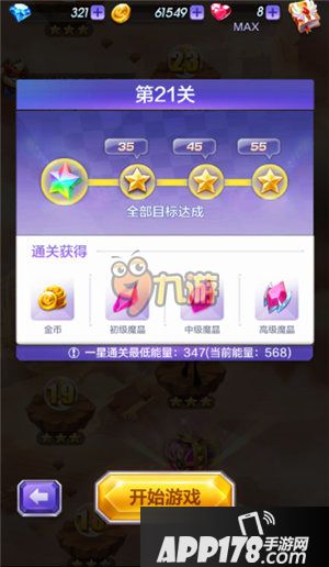 本关的通关要求是获取一定数量彩色星星,3星通关条件是获取55颗彩星。一星通关最低能量是347,建议玩家要想获得三星,最低要达到500能量,当然啦,能量越高,容错率也越高。不过要想获得3星评分,仅仅是能量达到要求还是不够的,玩家还需要一定的技巧。