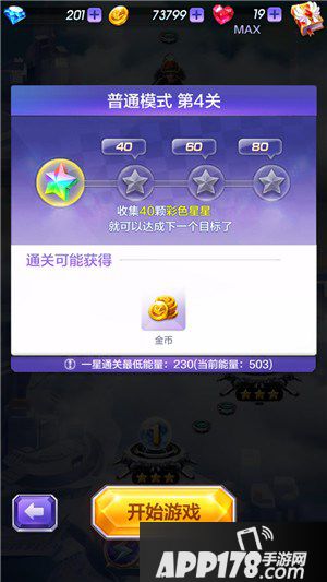 第四关的通关条件非常简单,一星通关仅需要收集40颗彩色星星,三星通关需要80颗彩色星星,一星通关最低能量值需达到230。