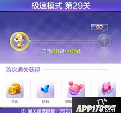 需要击飞90只小松鼠,通关最低能量760,最低能量要求没达到的朋友赶紧升级吧