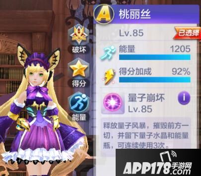 桃丽丝技能:摧毁前方一切并留下量子水晶和能量,可连续使用3次,本关由于没有分数上的要求,所以保命续航的技能最为实用,而桃丽丝的技能是自动释放,所以无需自己动手去点,比较好用。