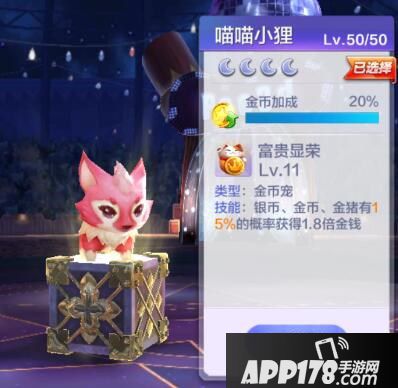 这里以金币宠优先,大家可以根据自己拥有的宠物情况选择。小虎选择的是喵喵小狸,,满级状态下银币,金币,金猪有15%的概率获得1.8倍金钱,很不错的收益效果。