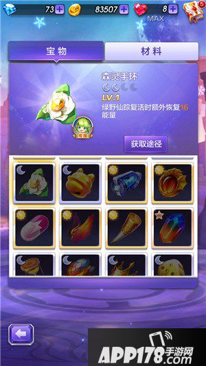 宝物搭配:森林手环,绿叶仙踪复活时额外回复15能量。
