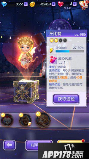 主动技能:每5次惊险闪避后射出一只爱新箭,每颗爱心可恢复2.0能量,提供40基础得分。