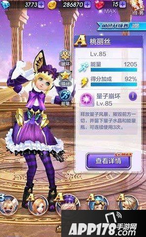 在女性角色里,有一个深受大家喜欢的角色是我们的桃丽丝,桃丽丝可以说是比较大众的角色,在多人对战里经常可以看到她的身影。首先桃丽丝的满级角色是85级,这就比疾风少年的75级占有更大优势。桃丽丝值得培养的另一个原因是相比较魔女娜娜与魔力可可,满级状态下桃丽丝能量上限高出100多点,加分高出15%左右。