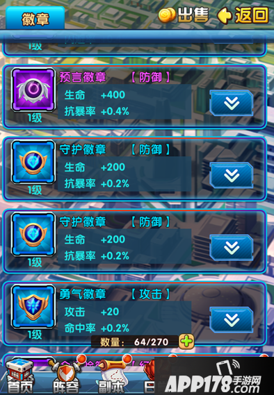 3、徽章强化所需其徽章可以吞噬除橙色徽章外所有徽章,当全身6名英雄徽章全配齐之后,紫色徽章也便作为提升强化经验用。