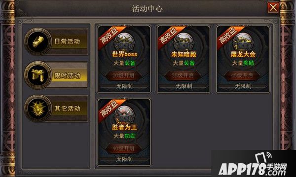 副本活动:《铁血沙城》的副本设计非常明确,需要什么就可以去哪个副本里打,日常需求、材料、装备均有产出,而且挑战起来没有什么难度,玩家可以轻松搞定。BOSS系统中的BOSS们大家都很熟悉,奖励也很丰厚,不过对级数有要求,符合等级前置条件才能进入挑战;如果这些满足不了你的挑战欲望,野外还会定时刷新一批,想怎么打就怎么打。