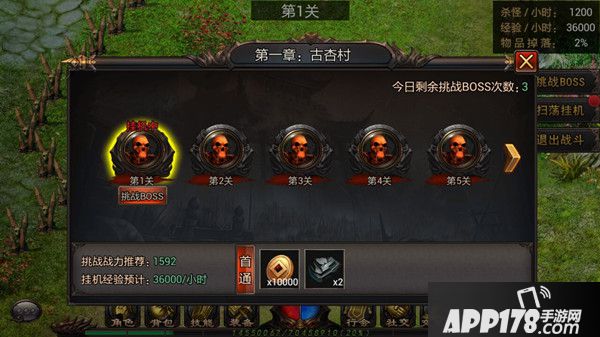 挑战BOSS每天是只有3次挑战次数的,没有额外有次数购买,所以建议每天都要把挂机BOSS打了,这样挂机的经验才会越来越高,升级也越来越容易了。首次通关还会有金币和材料奖励哦。
