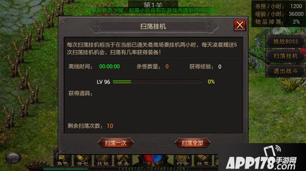 挂机系统还提供一个扫荡挂机功能,扫荡挂机每天会有5次扫荡次数,VIP等级会赠送扫荡次数,最多赠送5次,每天最多会有10次扫荡次数。通过扫荡功能,可以快速的清怪和快速获得经验,不需要自己去打怪了。