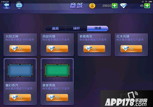 进入到商城,我们可以看到有三种类型的物品,道具、球杆和球桌,购买球桌不仅能获得球桌,还可以赠送金币哦,钻石充足的小伙伴还在等什么呢。
