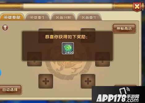 抽铜板10连抽,铜板抽的道具也不错,有紫色武将、包子、铜钱箱子、还有紫色神器宝物碎片喔。抽到的武将直接分解,分解的玉魂可以去神秘商店换取武将魂魄,8000玉魂可以换取10个红将魂,可以用元宝刷新神秘商店。同时,也可以用刷新卷轴来刷新,这样几天就可以弄到想要的红将了。
