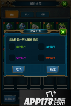 点击批量分解功能,玩家能勾选配件品质进行批量分解,便于玩家操作。