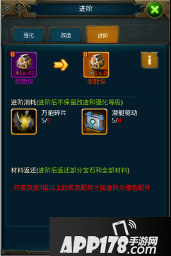 进阶需消耗万能碎片和对应兵种的驱动,驱动可通过跨服战商店获得。配件的品质和等级越高,需要消耗材料的数量越多。进阶完成后,紫色配件被消耗,会返还部分宝石和全部的改造材料。进阶后,强化等级和改造等级均不保留。