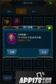 在配件仓库中点击碎片,弹出碎片查看框,选择合成按钮进行合成操作。根据碎片的品质进行合成能得到蓝、紫色碎片。