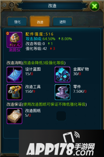 改造需要消耗多种材料:设计蓝图、金属矿物、改造工具和零件。配件的品质和等级越高,需要消耗材料的数量越多。