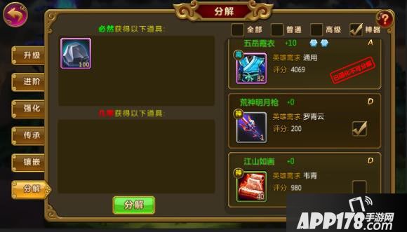 当我们打开宝箱,获得神器的时候,那个爽那个的确是无所能及,但是静下心来一想,但是却让人生气莫名!!汗,这神器用不上啊!都没有适合的英雄使用!!不过,幸好我发现了一个小技巧只要我们把神器给分解了(+_+!!!谁做的设计?谁会去分解神器啊!)