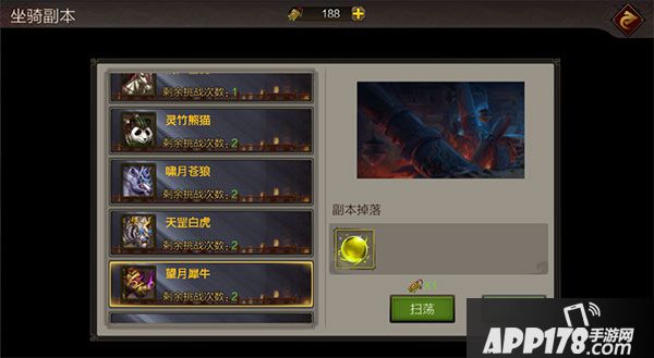 打开游戏主界面的日常按钮,即可找到进入坐骑副本的通道,获取坐骑会开启相对应的坐骑副本,挑战成功即可获得坐骑丹、军阶令牌、血饰碎片等奖励。首次完成挑战后可以消耗扫荡令进行扫荡,大大节省了很多时间哦!