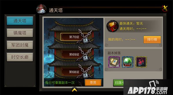 打开通天塔界面,可以在界面的左边查看和选取塔层。最高为70层,挑战层数越往上,怪物的能力就越强,随之获得奖励也就越好!每日有一次重置的机会,重置后,可以挑战已经成功通关过的关卡。