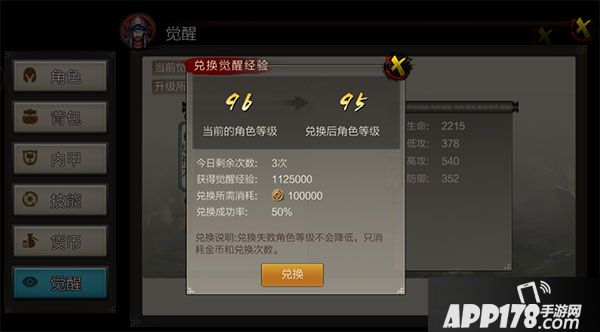 这里就需要注意啦:用角色经验兑换兑换觉醒经验,角色等级会下降。兑换失败不掉角色等级,只消耗银两和兑换次数。