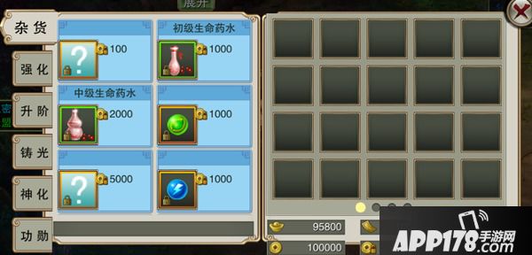2、商店内出售的道具分为药品、强化石、升阶石、铸光卷轴以及神化卷轴。除药品可直接使用铜钱购买外,其他道具需要使用低级道具兑换,如消耗低级强化石换取中级强化石。