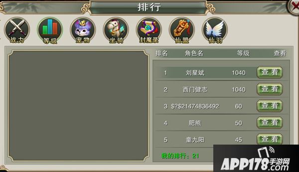 1、排行榜分为战力、等级、宠物、坐骑、封魔录、仙盟、仙羽这7种。