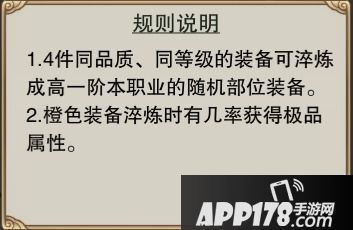 1、淬炼可以把4件同品质、同等级的装备淬炼成高一阶本职业的随机部位装备。