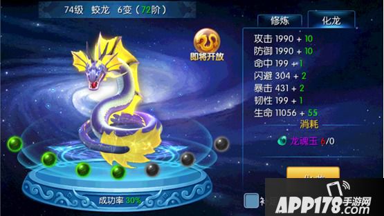 3、提升化龙等级需要消耗龙魂玉。点击下方化龙按钮,消耗对应数量龙魂玉,即有机会提高化龙等级。龙魂玉可通过每日在线奖励、活动以及商城购买获得。