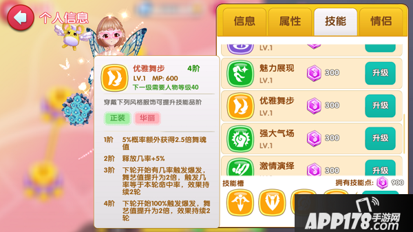 3.舞技通关类,比如说第一章的2.6.7.8.10关卡,这种关卡在故事里还是比较多的,想要通关除了对技术的要求外,选对技能还能让你更容易拿到三星哦,所谓技能在你的个人信息里如图