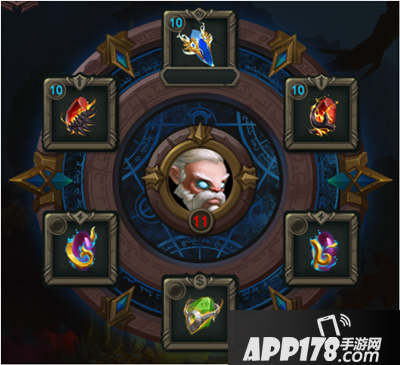在英雄界面中可以打开神石的镶嵌界面,每种类型的宝石都有对应的镶嵌卡槽。