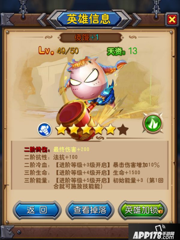 英雄可以消耗指定数量的道具来进行进阶,每次进阶都可以解锁一个天赋技能。