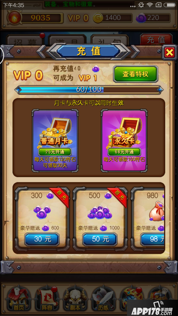 点击充值按钮进入充值界面,可查看当前vip等级,vip特权,以及快速购买的按钮。