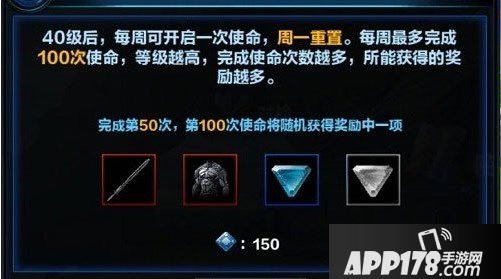 在我们40级后,每周开启一次使命,然后在周一的早上重置。记住每周只有完成100次使命的机会,而且这个是根据等级的变化来的,等级越高,完成使命次数也就越多,获得的奖励越多。当我们完成第50次,第100次使命将随机获得高级奖励。在初期使命完成还可获得金币和经验哦,现在你准备好完成使命人物了吗。