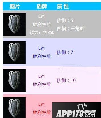 1、胜利护盾等级是1级,拥有的防御力是5点,战斗力越是350,凹槽未三角形。