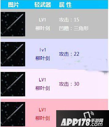 等级1级的柳叶剑,凹槽是三角形。出现的攻击力有15,22,30点。