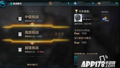 无尽之剑命运高级挑战推荐战斗力与经验,高级挑战中,我们遇到的boss攻击力就是比较强大的了,挑战模式可以给勇士提供大量的经验,是勇士快速提升等级的重要途径。挑战模式中的高级挑战属于第三个难度的挑战,最多可获得3000经验,但想要成功击杀BOSS,可有不小的难度。