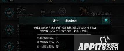 在《无尽之剑:命运》无尽轮回系统中,转生可以开启新的轮回。这里的开启新轮回,并不是说进入轮回下一层这类,而是从已经完成的轮回的最高层重回第一层,重新开始新一轮的轮回之战。玩家转生次数每日有限,转生时会根据玩家角色在轮回战斗中的表现获得记忆碎片,当前完成轮回数、通过的轮回试炼、战斗记忆和宝箱都会影响最后获得记忆碎片的数量。