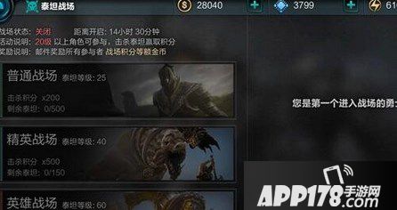 泰坦战场是限时开放的,等级达到20级及以上的玩家均可在开放期间内进入战场内进行挑战,战斗采用手动模式。战场根据泰坦等级高低分为普通战场、精英战场和英雄战场,其中普通战场内的泰坦等级25级,为骑士系泰坦,体形和人类差不多,攻击灵活克招架、闪避,不过只要等级、战斗力压制得住的话,成功击杀并不难,总数量为500只,每击杀一只可获得积分200。