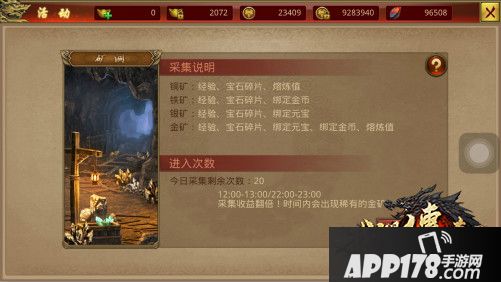 玩家每日有20次采集次数,从PK活动点击矿洞按钮进入,这是一处充满惊悚氛围的环境,但不会阻挡冒险的脚步,采集矿产将会获得大量宝石及高额诱人的经验等。需要小心的是,矿洞潜伏着危机,大量不同种类的怪物藏匿在黑暗角落。提醒玩家,为了挖矿效率,咱还是尽量选择避开魔物的区域挖矿吧~