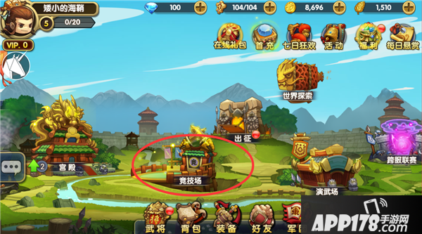 竞技场是每个游戏中必不可缺的游戏系统,上图点击红圈内即可进入竞技场系统。游戏中当玩家等级到达13级后开启竞技场。首次进入竞技场的时候需要设置战斗及防守阵容,并且在游戏初期要经常更新阵容,避免当你获得较高排名时被他人攻打下来。