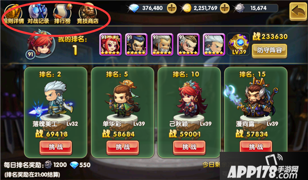点击上图中“防守阵容”即可设置竞技场防守阵型。竞技场每天有5次挑战机会,当然也可通过钻石重置挑战次数。当你觉得当前玩家过于强大的时候可点击“换一批”刷新较弱的对手。竞技场战斗胜利会获得竞技场币,玩家可在竞技场商店兑换相应道具。
