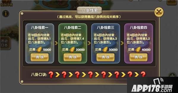 在世界探索中主公还有机会探索到“八卦线索”,进入后通过挑战获胜可以获得八卦口诀,在“勇闯八卦阵”玩法中按口诀逐一进行挑战能最终获得八卦宝箱奖励哦~