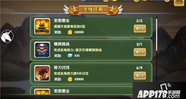 按照游戏主线任务,当每个主公到达一些任务条件后,即可能完成任务,点击已完成的任务即可获得奖励。
