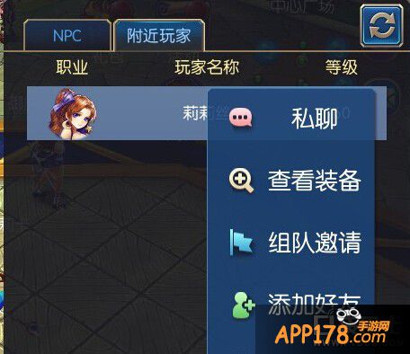 点击“附近玩家”标签则进入附近玩家查找界面,打开界面时会自动寻找视野内最多30名玩家,并将结果显示在列表中,在这里可以看到玩家的职业、名称和等级。点击玩家,可进行私聊、查看装备、组队邀请、添加好友和添加黑名单的操作.